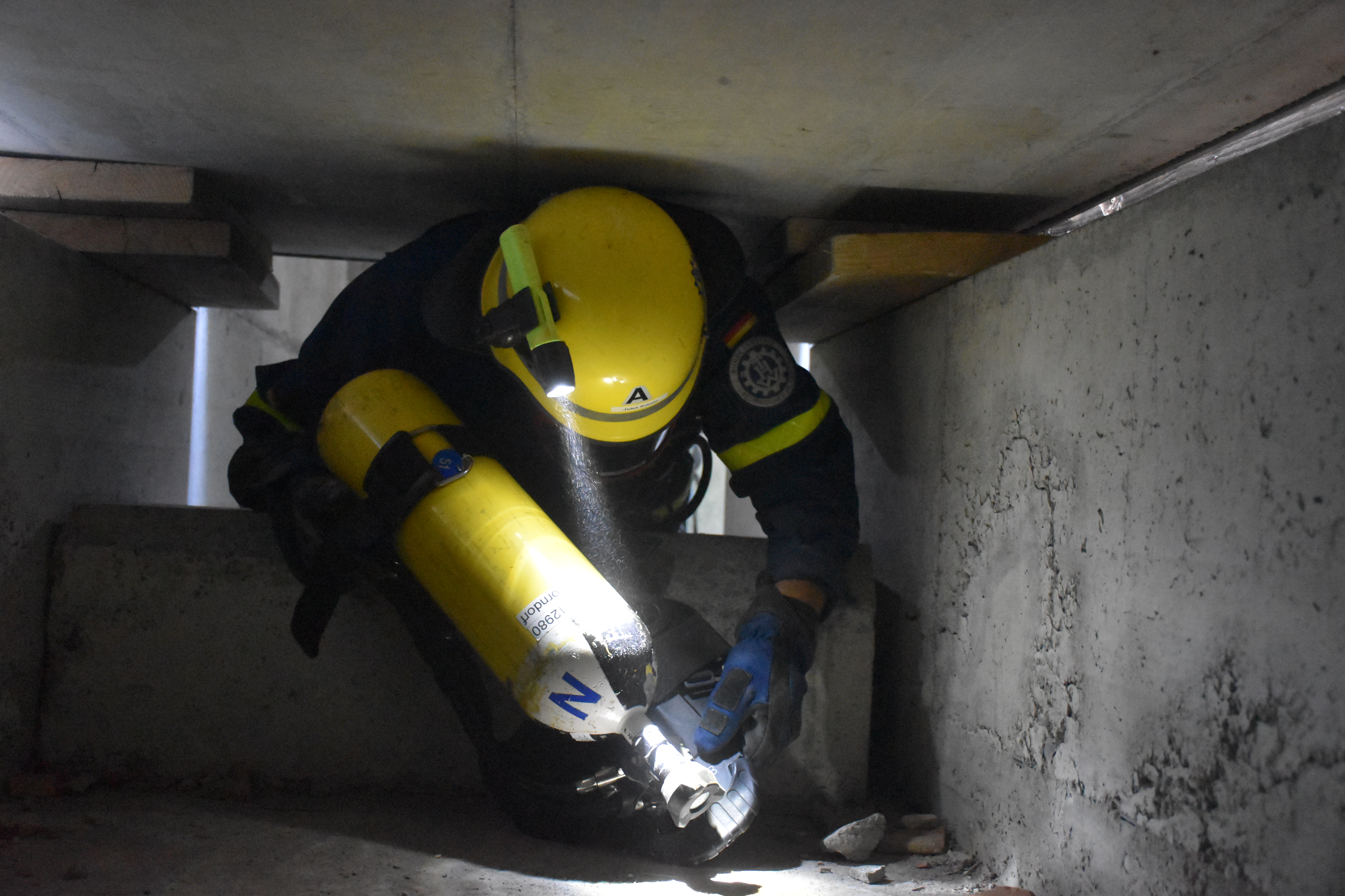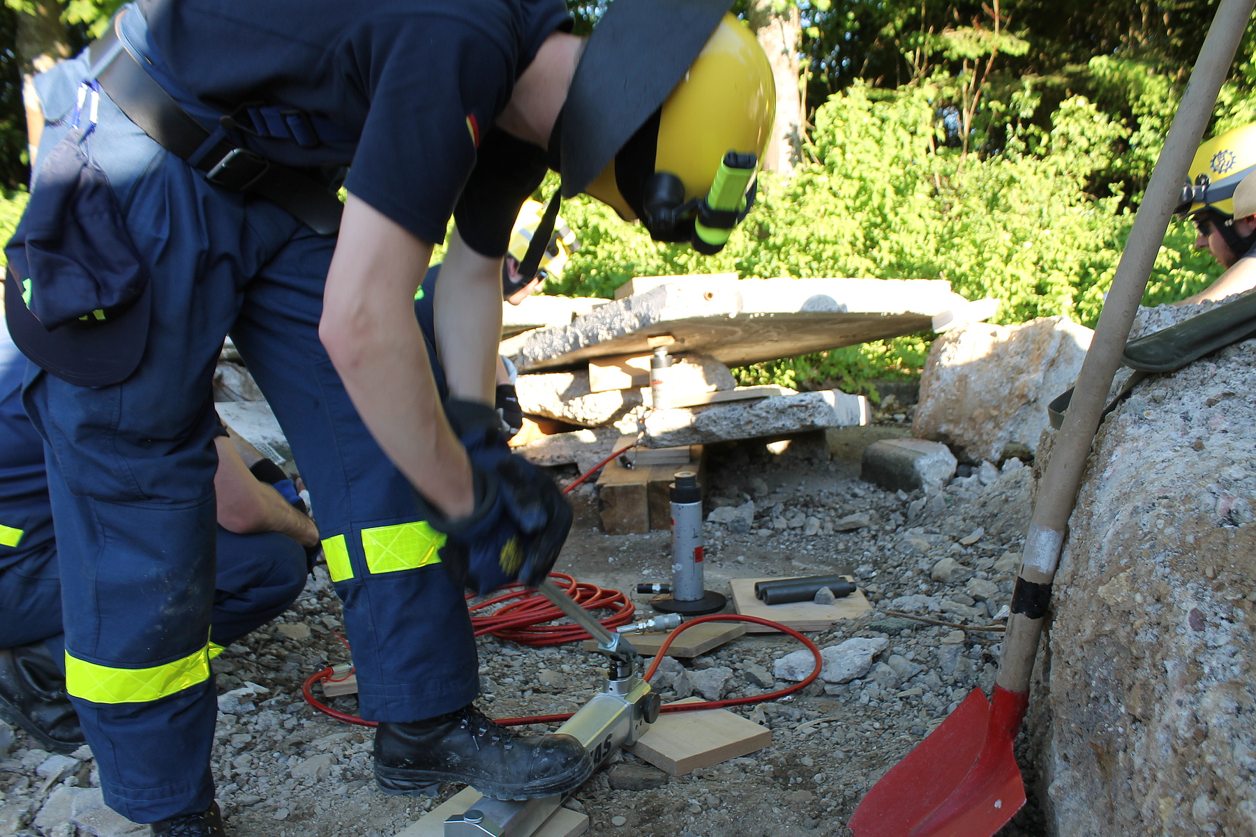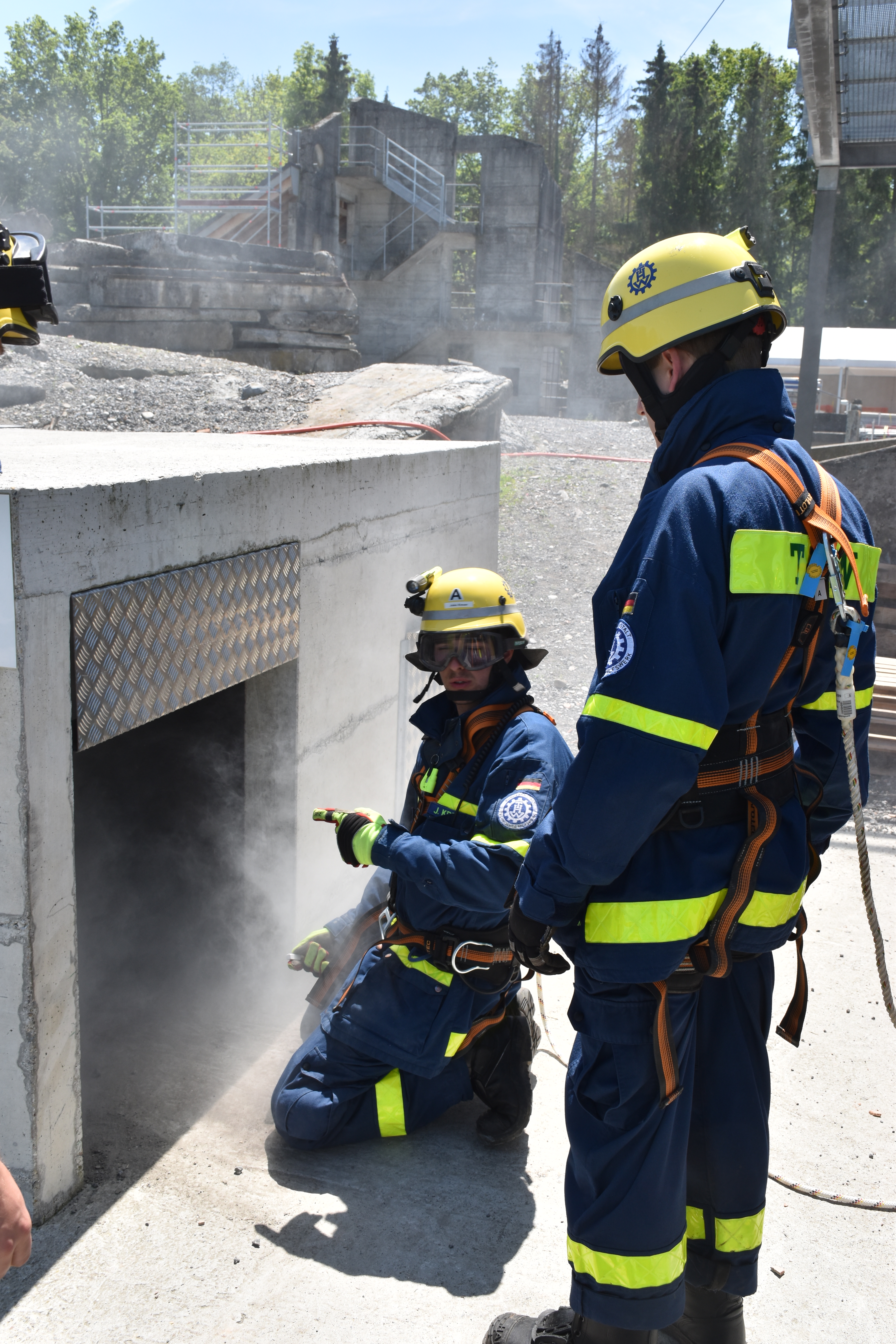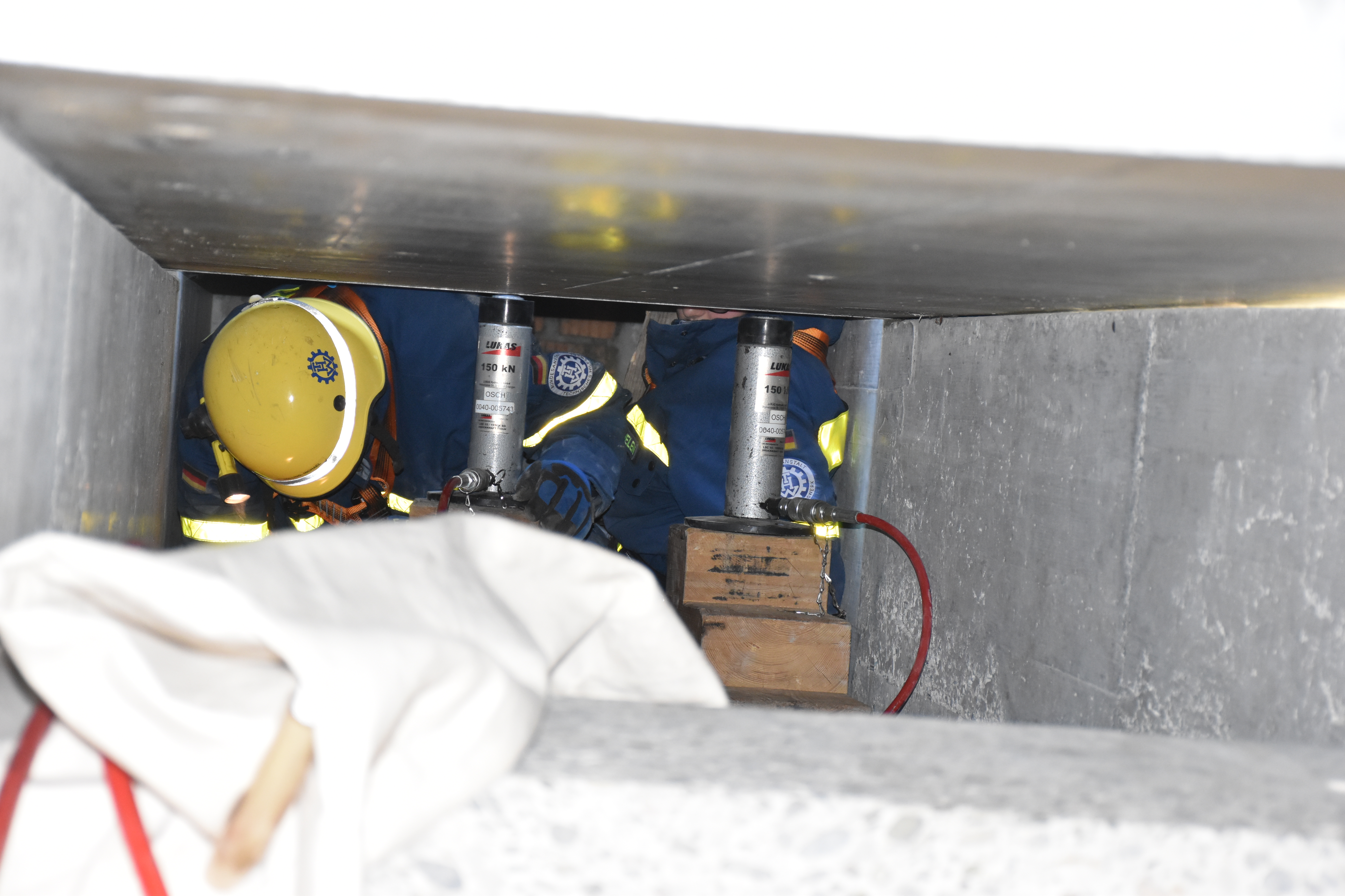 Bei sommerlichen Temperaturen wurde die Ausbildung am Freitag und Samstag fortgesetzt. Themen wie das Retten von Personen aus Fahrzeugen – z. B. einem umgekippten Bus, das Abstützen und Aussteifen eines einsturzgefährdeten Kellers, sowie die Errichtung einer Seilbahn zur Personenrettung und das Schaffen von Öffnungen in Wänden standen dabei auf dem Stundenplan. Unterbrochen wurde die Ausbildung der ehrenamtlichen Rettungskräfte durch den Überraschungsbesuch der kirchlichen Trauung eines Kameraden am Samstag Nachmittag. Von dort zurückgekehrt, setzten sie sich anschließend mit dem Bewegen von Lasten mittels Hydraulikheber und Hebekissen auseinander. Den Abschluß des Ausbildungswochenendes für die 21 Ludwigsburger und drei Schorndorfer Helfer bildete die Lektion am Sonntagmorgen. Unter Atemschutz mussten ein Gebäudeteil durchsucht und verletzte Personen gerettet werden.