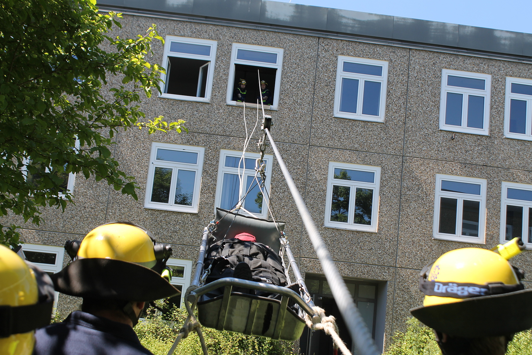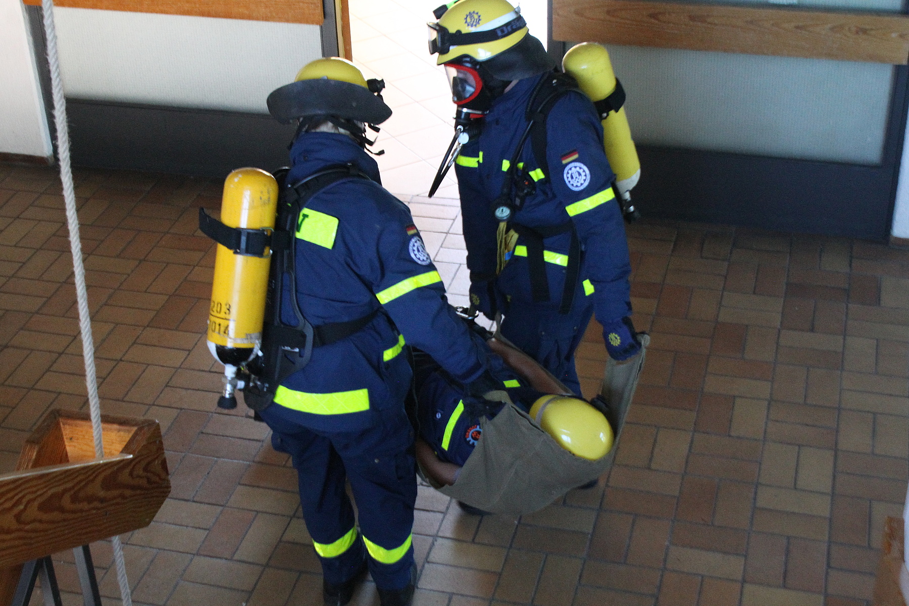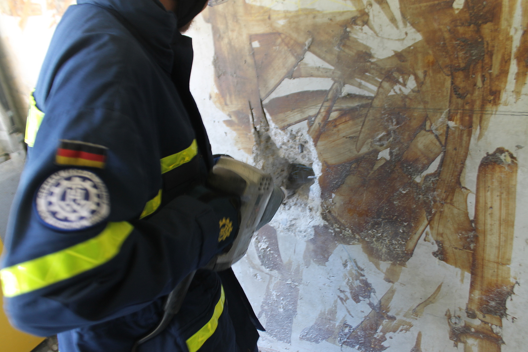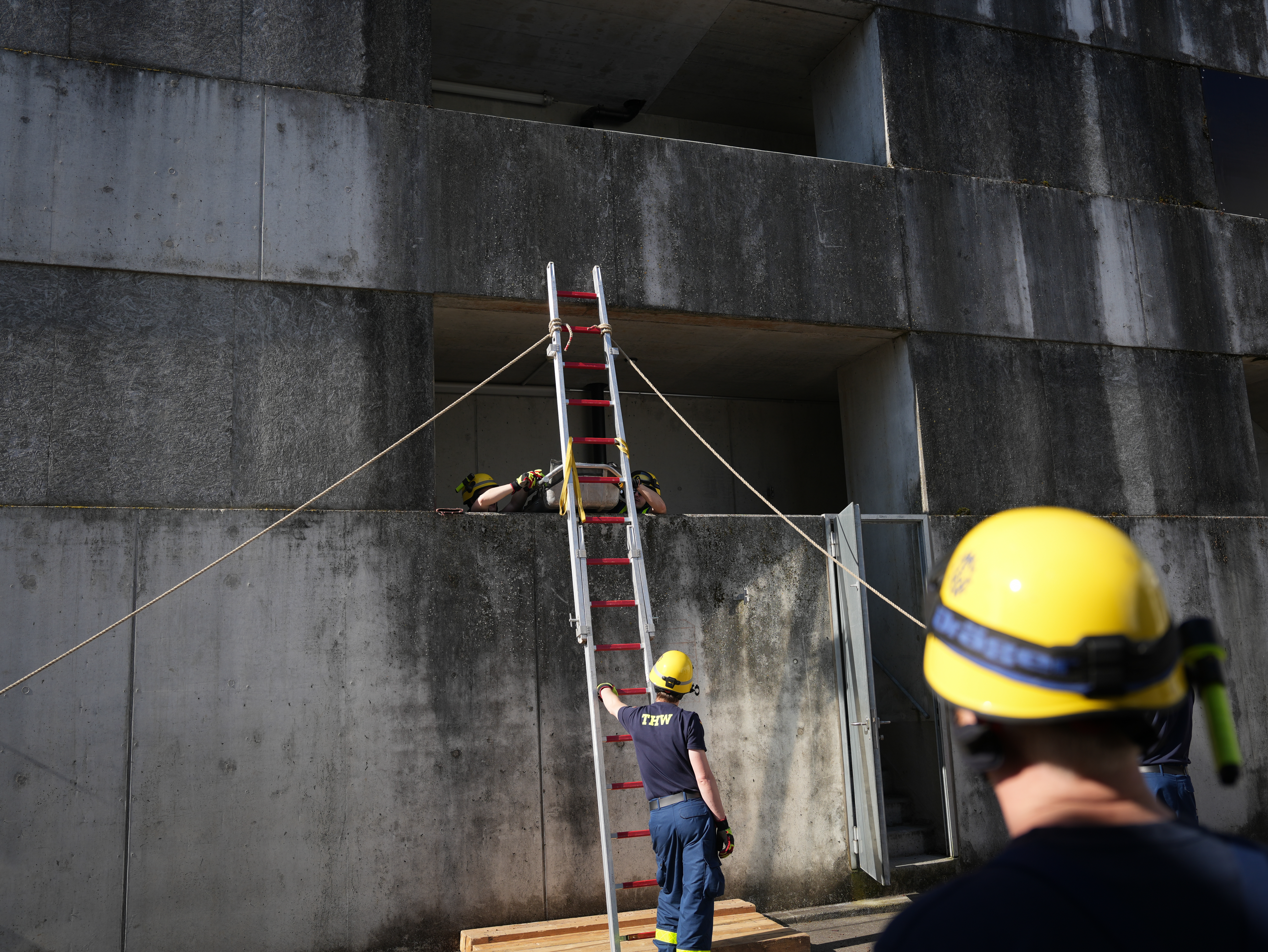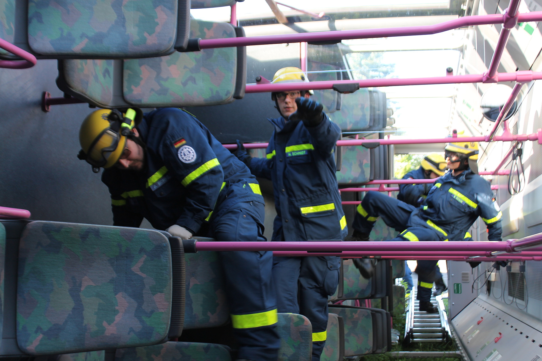 Bei sommerlichen Temperaturen wurde die Ausbildung am Freitag und Samstag fortgesetzt. Themen wie das Retten von Personen aus Fahrzeugen – z. B. einem umgekippten Bus, das Abstützen und Aussteifen eines einsturzgefährdeten Kellers, sowie die Errichtung einer Seilbahn zur Personenrettung und das Schaffen von Öffnungen in Wänden standen dabei auf dem Stundenplan. Unterbrochen wurde die Ausbildung der ehrenamtlichen Rettungskräfte durch den Überraschungsbesuch der kirchlichen Trauung eines Kameraden am Samstag Nachmittag. Von dort zurückgekehrt, setzten sie sich anschließend mit dem Bewegen von Lasten mittels Hydraulikheber und Hebekissen auseinander. Den Abschluß des Ausbildungswochenendes für die 21 Ludwigsburger und drei Schorndorfer Helfer bildete die Lektion am Sonntagmorgen. Unter Atemschutz mussten ein Gebäudeteil durchsucht und verletzte Personen gerettet werden.
