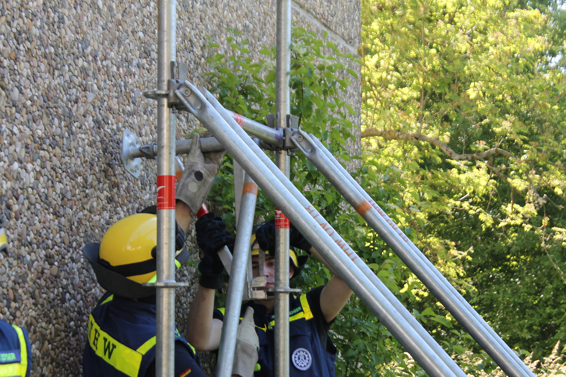 Während des Ausbildungswochenendes übten die Bergungsgruppen unter Anderem den Aufbau von Wandabstützungen mit dem Einsatzgerüstsystem. Um zwei gegenüberliegende Wände abzustützen, wurde ein Sprengwerk aus Holz errichtet. Auch das Erkunden von Einsatzstellen und die Personenrettung mit verschiedenen Mitteln wurden geübt. So standen der Bau einer Seilbahn unter Verwendung eines Greifzugs und die Nutzung eines Leiterhebels auf dem Ausbildungsplan. Gleichzeitig fand die Ausbildung der Zugtrupps statt. Hier standen unter Anderem das Führen von Einheiten, Führen einer Lagekarte und das Betreiben eines Meldekopfs an.