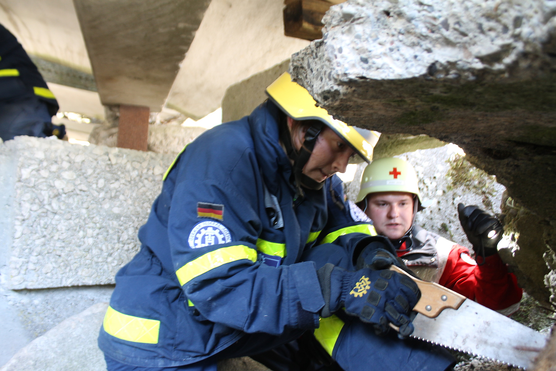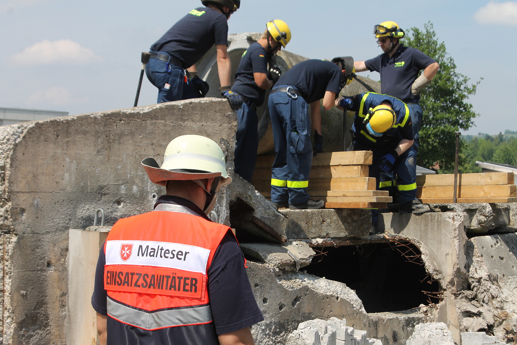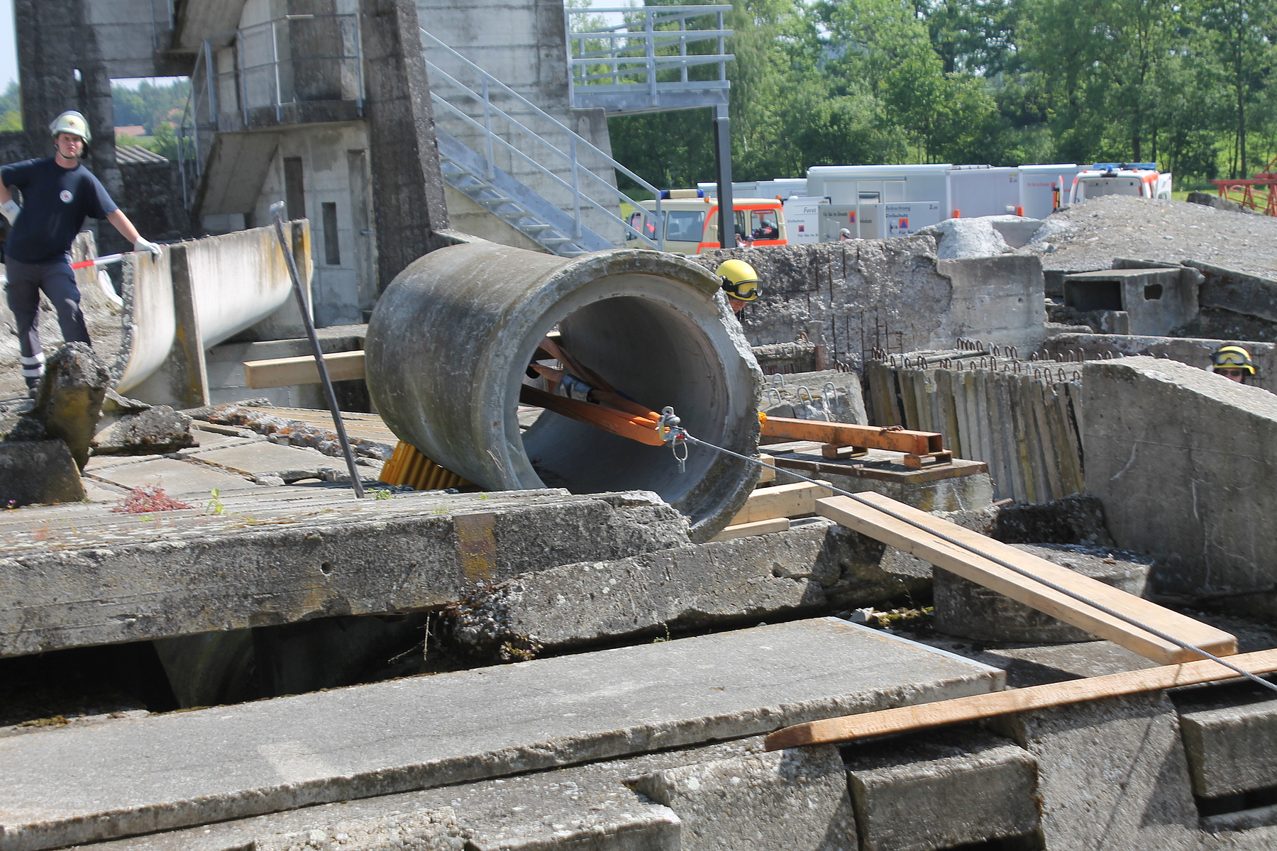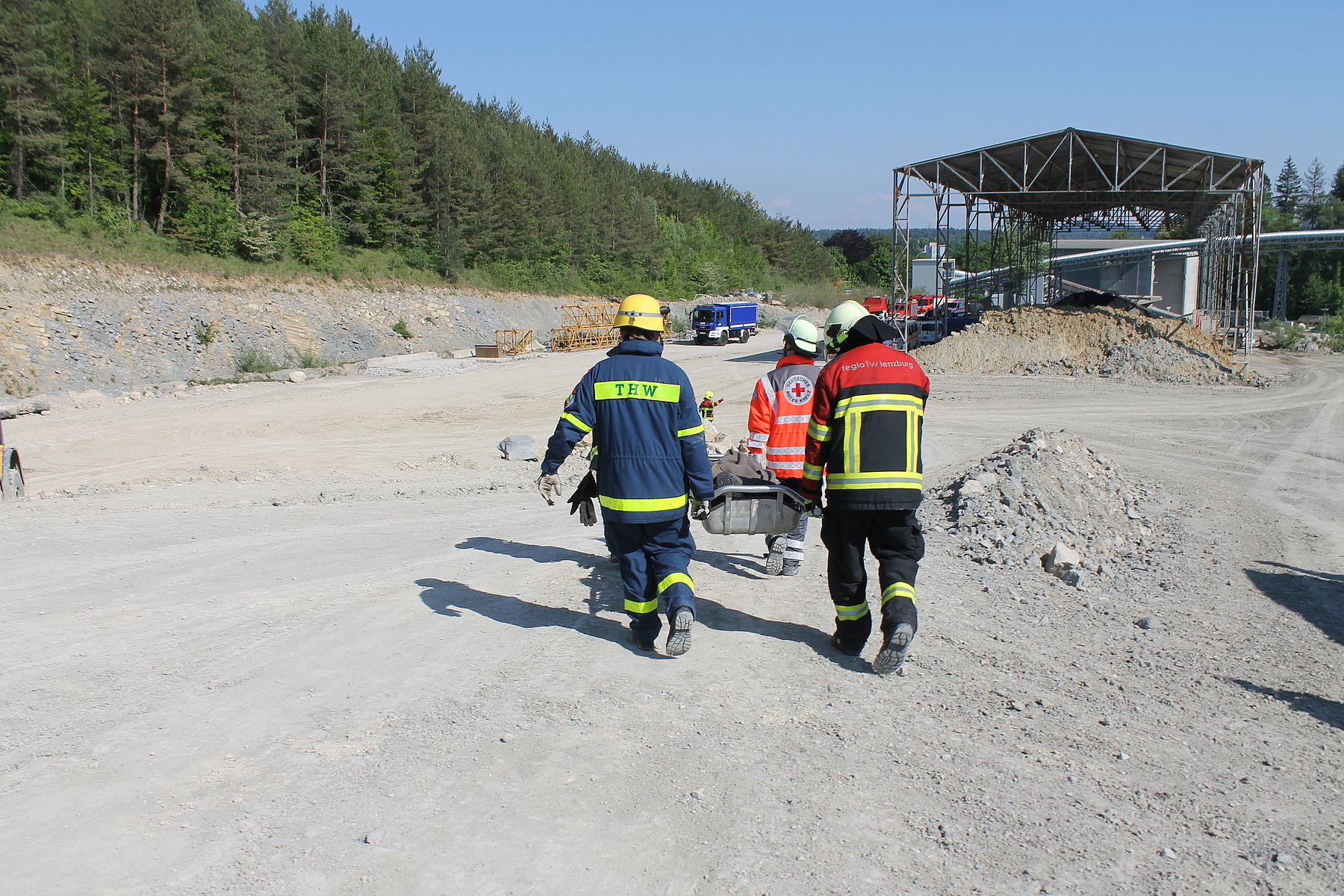 Der Brückentag wartete mit zwei Einsatzübungen auf: zunächst auf dem Übungsgelände des Zivilschutzausbildungszentrums Sempach und später in einem Steinbruch bei Wildegg. Im Rahmen der Einsatzübung am Morgen mussten zahlreiche Verletzte aus dem Trümmergebiet gerettet werden, bevor diese von den Rettungsdienstkräften versorgt wurden. Am Nachmittag verlegten die Kräfte schließlich nach Lenzburg im Kanton Aargau. Zusammen mit dem Pionierzug der Regiofeuerwehr wurde im nahegelegenen Steinbruch das Retten aus Fahrzeugen – mittels hydraulischem Rettungsgerät – unter erschwerten Bedingungen geübt. Die Fahrzeuge waren teilweise verschüttet oder lagen an einem Steilhang. Die Chance zum gegenseitigen Austausch blieb nicht ungenutzt.