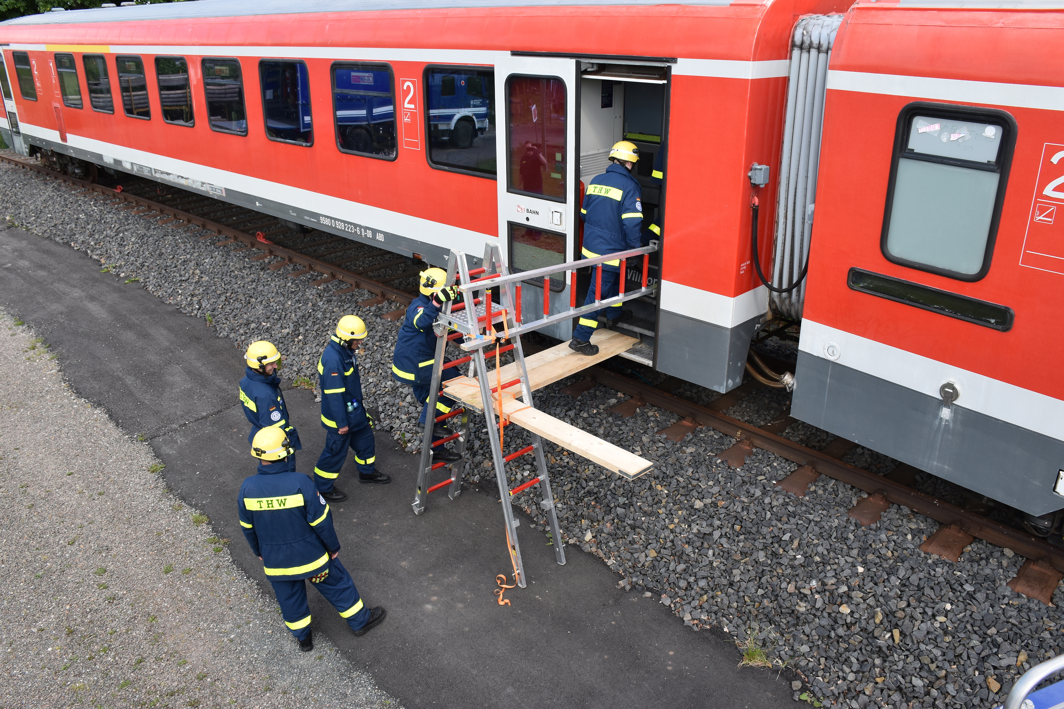 Am nächsten Morgen starteten die Teilnehmenden - aufgeteilt in vier Gruppen - auf dem Übungsgelände des Ortsverbandes Korbach in die Ausbildungseinheiten. Ausbildet wurden die Themen Füllen von Sandsäcken und deren Verbau als Quellkade, das Retten von Personen aus Trümmern, das Anheben und Aufgleisen eines entgleisten Zuges mit Hilfsmitteln des GKWs und Aufgleisgerät sowie das Evakuieren von Personen aus Schienenfahrzeugen.