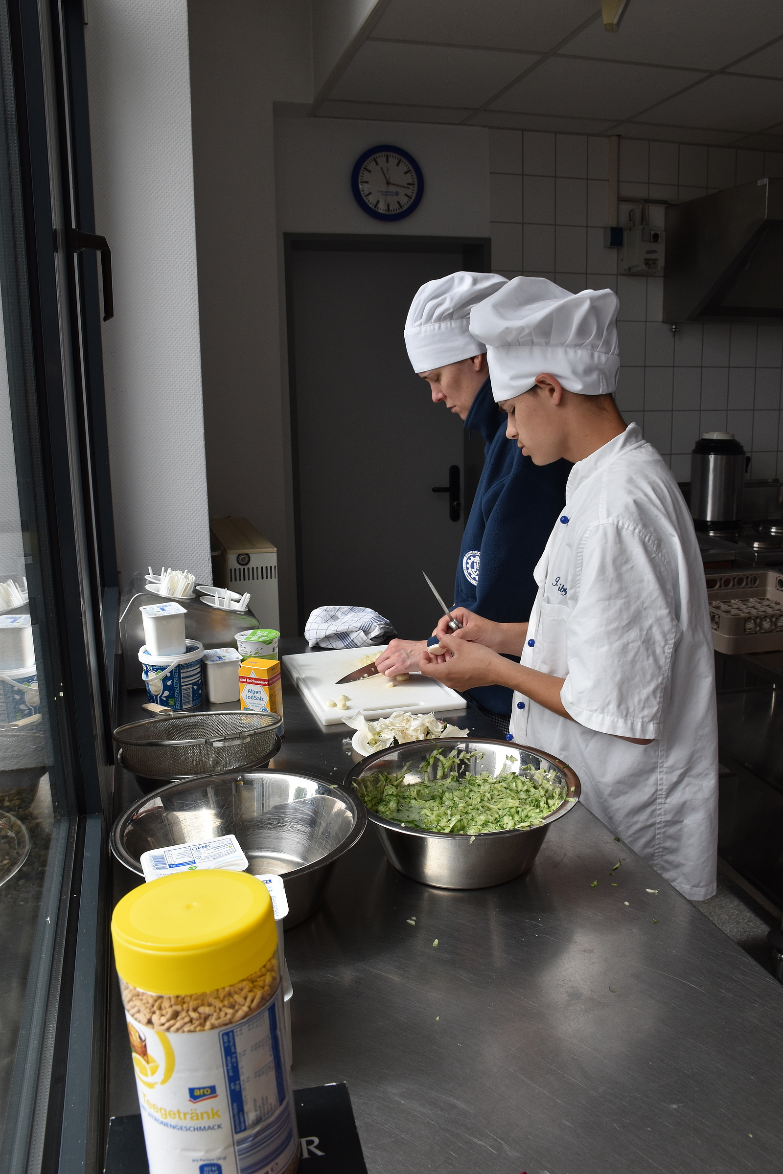 Für die Verpflegung sorgte die gleichzeitig stattfindende Ausbildung „Koch im THW", welche die Küche der Unterkunft und die mitgeführte Feldkochausrüstung nutzte. Die Kochausbildung sorgte für die Verpflegung aller Teilnehmer, während der Umgang mit Lebensmitteln, Hygieneregelungen und der Umgang mit Großküchengerät ausgebildet wurde.