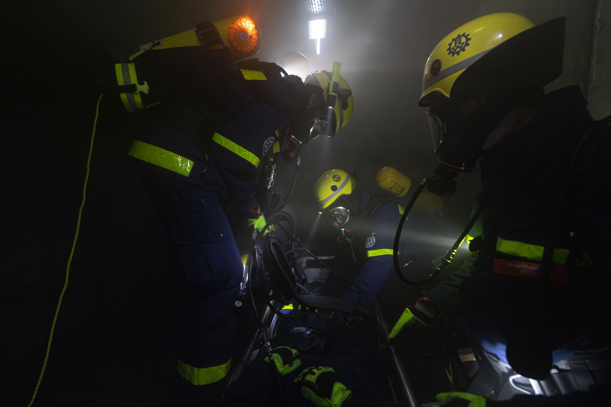 Abends legten die Atemschutzgeräteträger einer Zusatzschicht ein, um den Einsatz mit den Atemschutzgeräten zu üben, während weitere Helfer das Übungsgelände ausleuchteten.