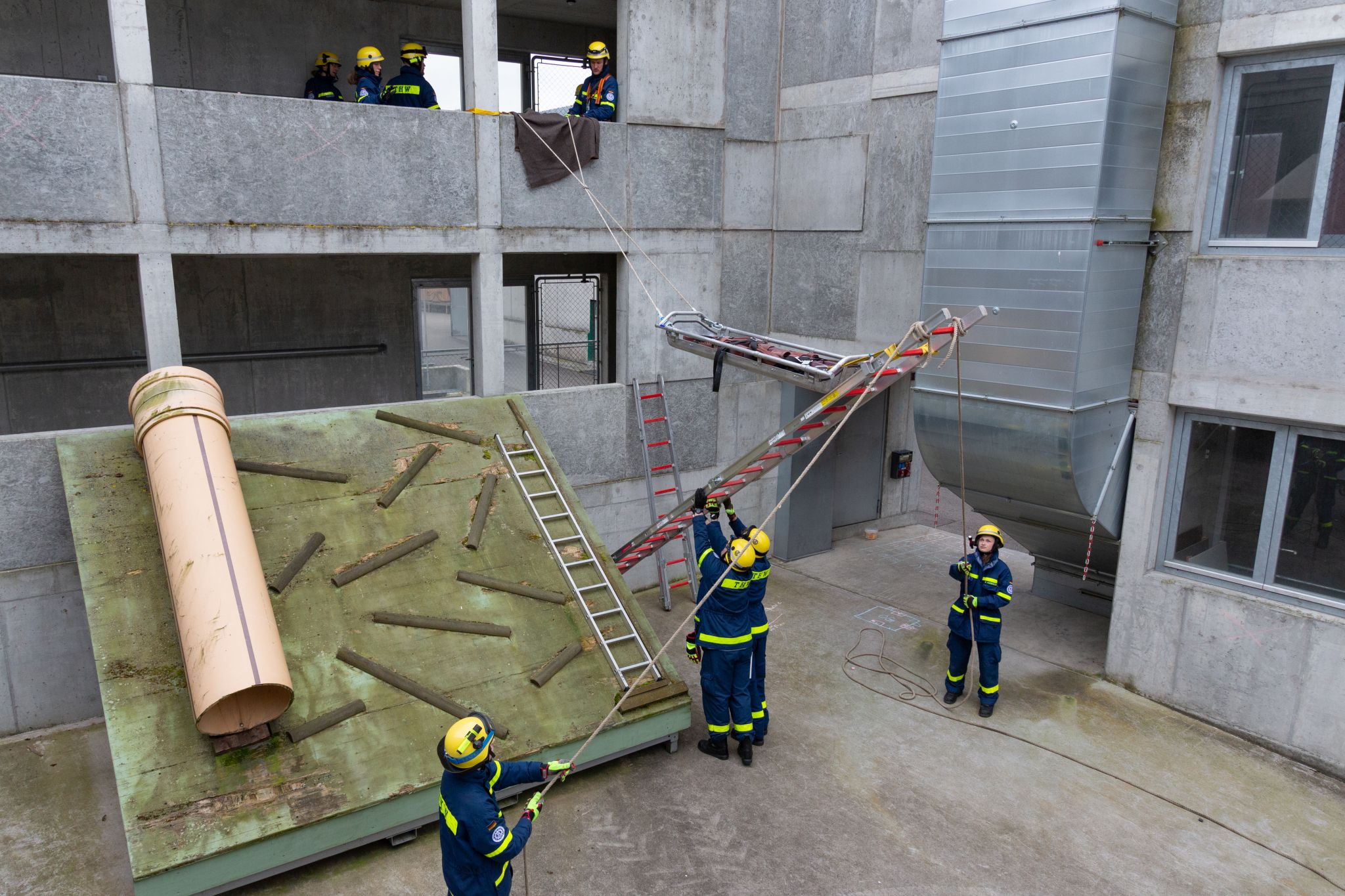 Das Gelände des Zivilschutzausbildungszentrums war am darauffolgenden Samstag Mittelpunkt des Geschehens. Verteilt über das gesamte Gelände standen in gemischten Gruppen vier Ausbildungsthemen rund um das Thema Retten von Personen auf dem Programm. So wurde u. A. mittels Behelfskontruktionen aus dem Einsatzgerüstsystem ab- und aufgeseilt und die korrekte Anwendung von Vakuummatratze und Schaufeltrage geübt. Mit dem Mehrzweckzug, den Hebekissen, der Büffelwinde und dem hydraulischen Spreizer wurden tonnenschwere Lasten bewegt oder im Tunnelsystem auf engstem Raum eine Personenrettung durchgeführt.